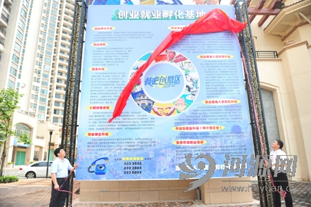 源城区人社局局长陈耀平与餐吧·创意区负责人李志辉为创业就业孵化基地揭牌.