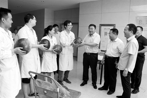 图为太康县高贤乡群众代表在向医院医务人员赠送西瓜。(