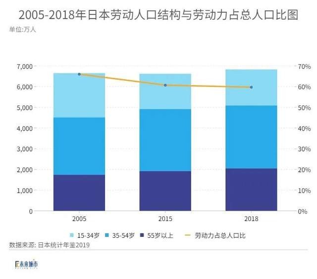 图片显示,2018年,日本的劳动力占总人口比降至60%以下,在劳动力比重持续下降的趋势下,中老年劳动力占劳动人口的比例逐步上升,同年,中老年人口占总劳动人口比重高达31.3%,反映出日本劳动力老化严重。