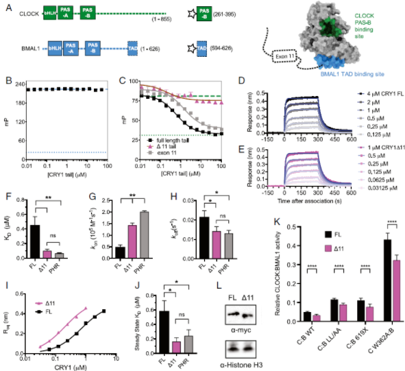 外显子11与clock pas-b竞争,降低cry1与clock:bmal1的亲和力_ 之后,研究人员使用生物层干涉术(bli)来定量评估全长cry1,cry1Δ11和无尾cry1 phr域对clock:bmal1的pas核心域的亲和力,发现与全长cry