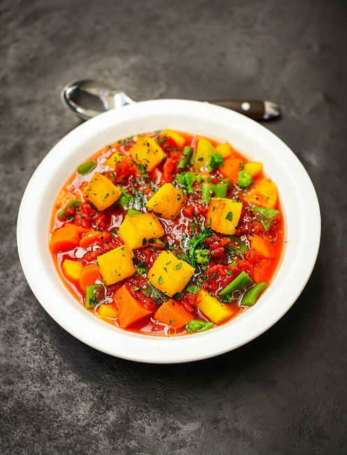 番茄风味炖杂蔬拌意式玉米糊块(波伦塔)