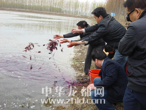 养殖人员往坑塘里投放蟹苗
