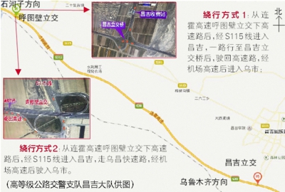 因连霍高速昌吉段往乌鲁木齐方向(k3666+385米处),下通桥梁板已严重损坏需修缮,故将连霍高速呼图壁立交至昌吉立交之间,石河子往乌市方向的40公里道路进行封闭施工,届时往乌市方向车辆只能从呼图壁立交驶出高速后绕行,施工将持续到7月6日结束。 【